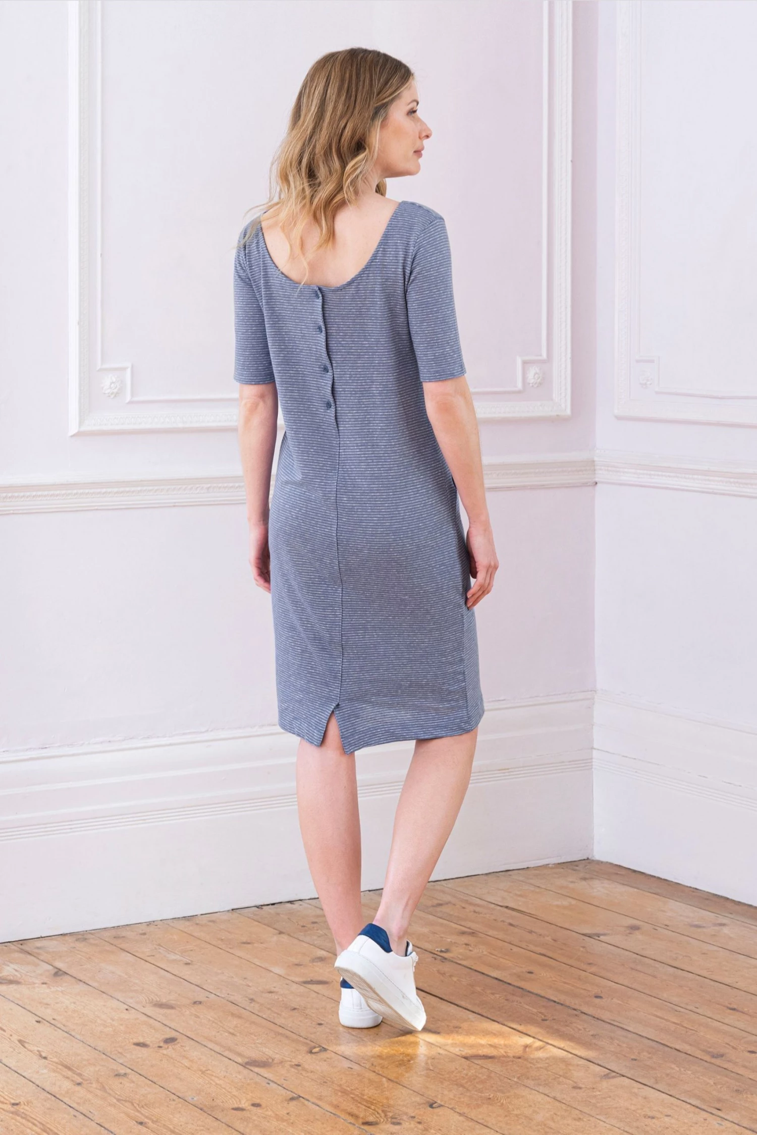 Designed to slip on effortlessly with a flattering fit that feels custom made, this short-sleeved dress is crafted in linen blended with cotton for an airy, lightweight feel that’s perfect on warmer days. Complete with side pockets and a wide, scooped neckline, it features buttons through the upper back and a slit at the rear hem. Style it with casual high-top trainers and a denim jacket for a laid-back look you’ll love. Length 100cm. Standard fit. Care: 30 degree machine wash with similar colours.