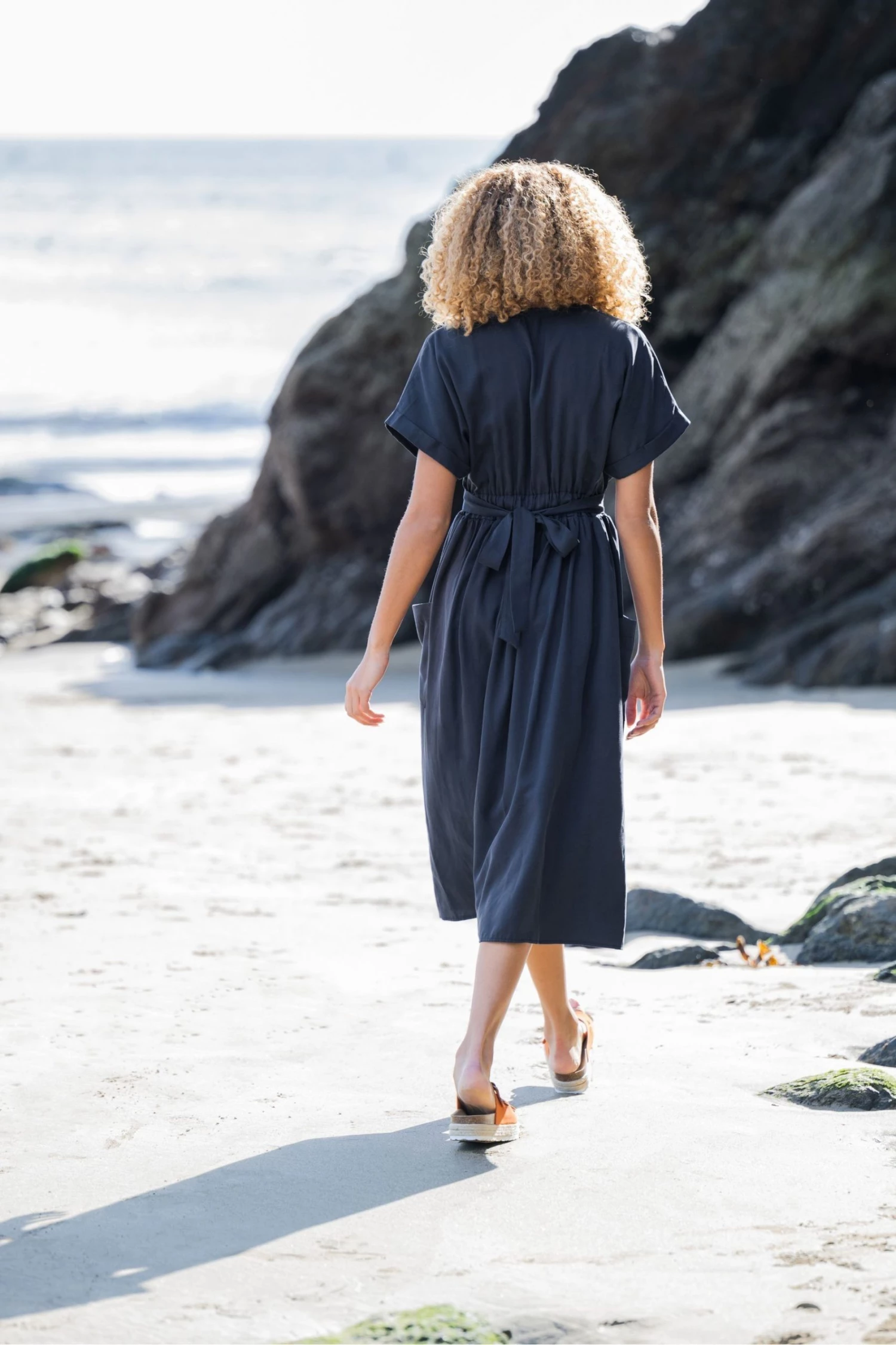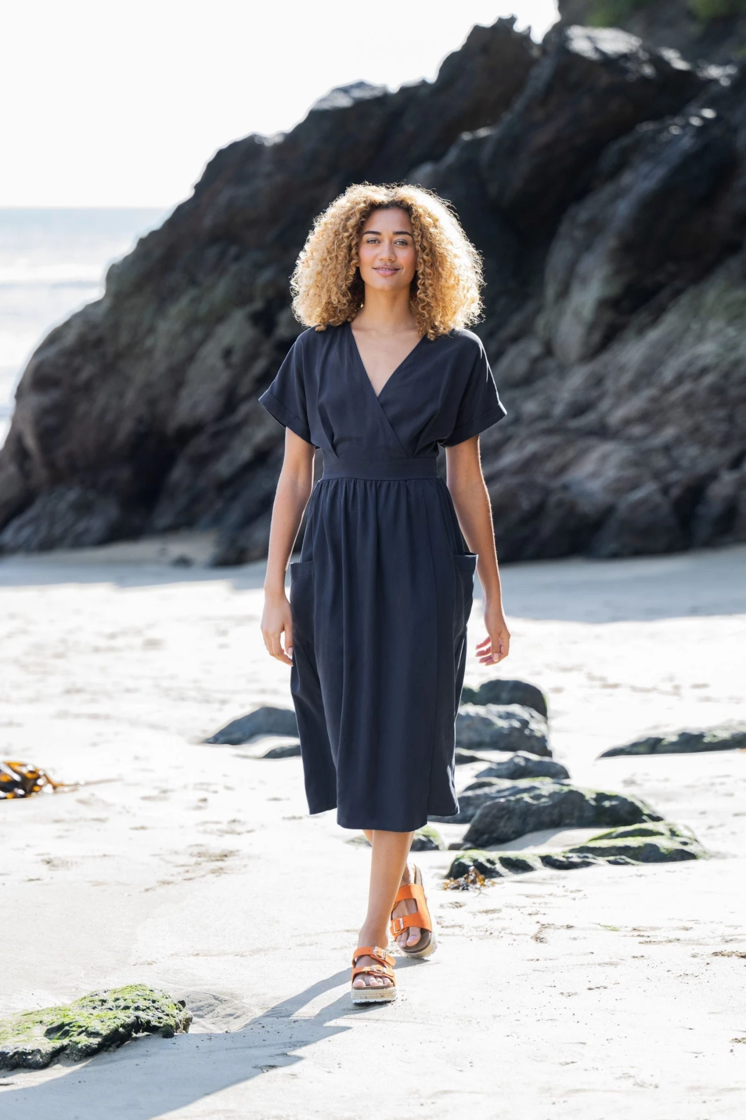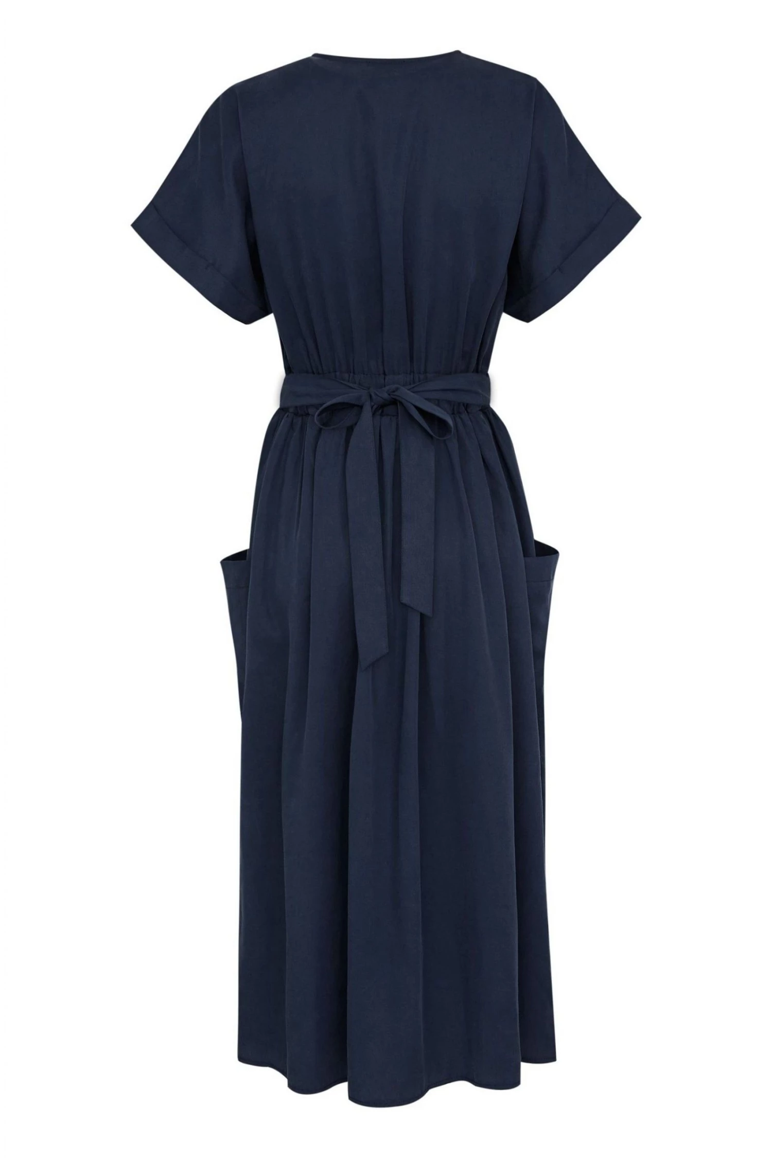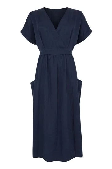 Featuring a V-neck faux wrap effect at the front, our dolman-sleeve dress is a feminine design you can make work for you. Style it for the office with pumps and a cardigan or just throw it on for weekend walks on the moors or at the beach. Cut to an easy silhouette with turnback cuffs, it’s gathered at the waistband and elasticated at the rear for a comfortable, flattering fit at the middle. The self-fabric belt can be tied at the front or back and side patched pockets add a casual note.