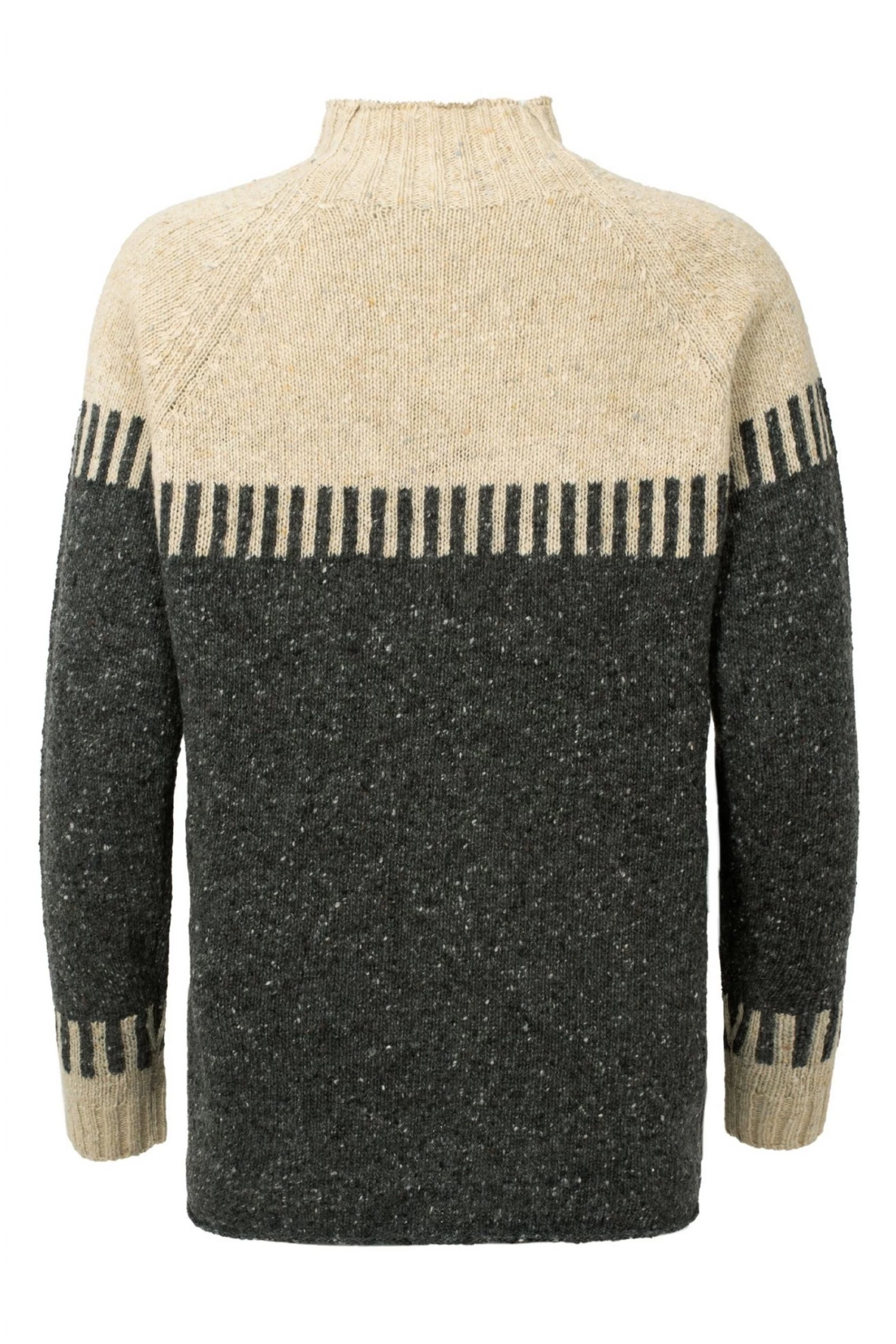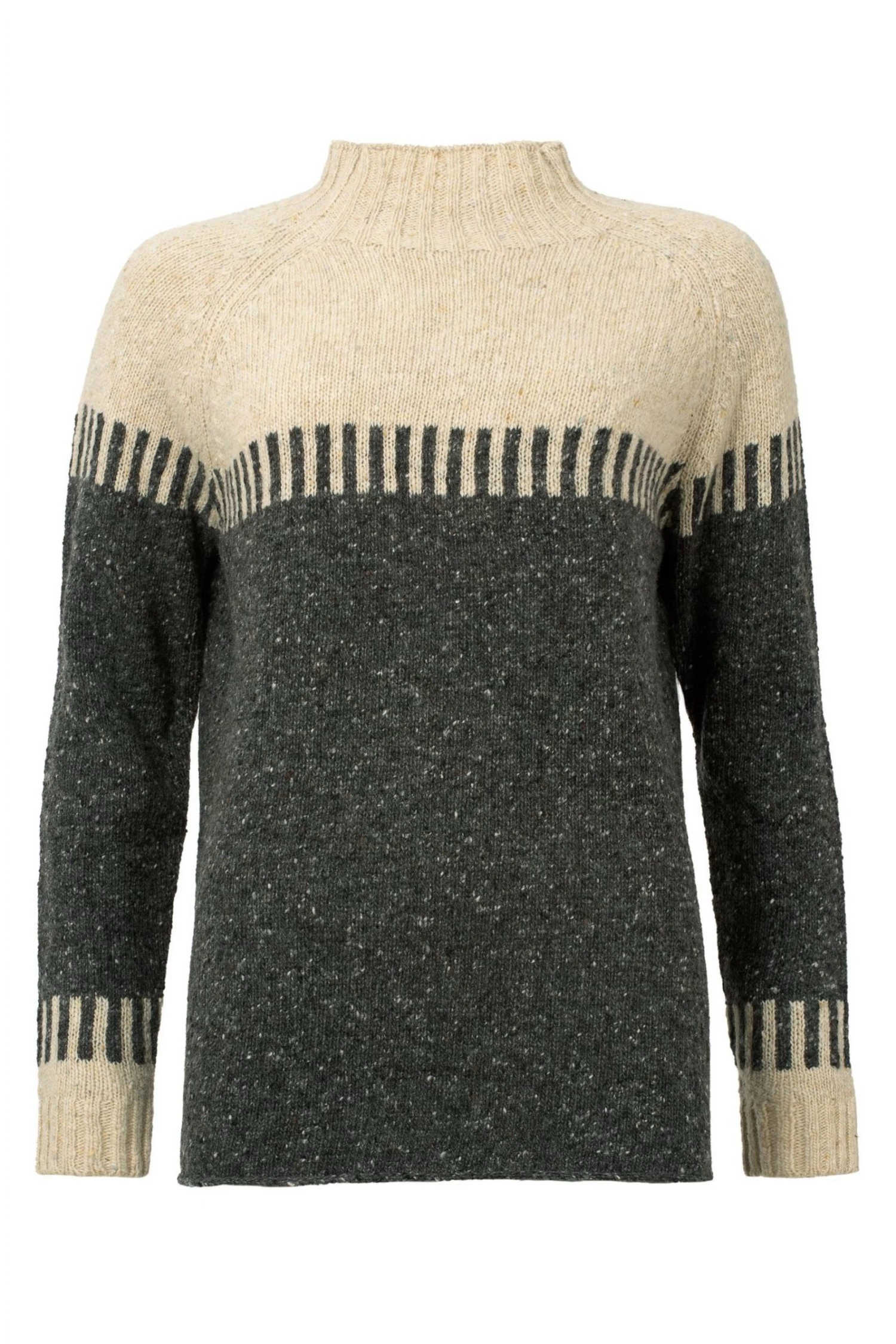 Cut to a generous shape for a cosy feel and easy layering, this funnel-neck jumper is crafted in genuine Donegal wool that’s been spun and dyed in Ireland for that authentic look. The yarns have been twisted to give a traditional nepped effect to the modern colour-blocking. The tunic length provides a little extra coverage, so it s perfect with slim-fitting trousers or denim. They’d suggest sizing down if you’d like a closer fit.