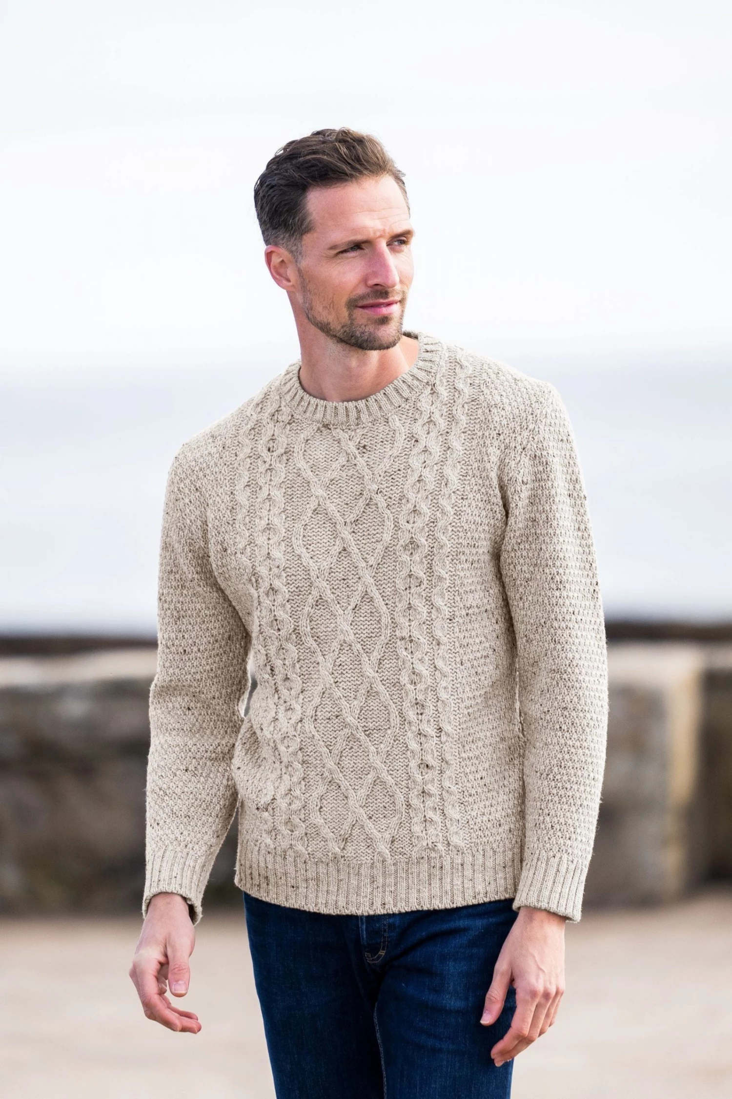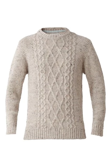 This men’s cable crew-neck jumper provides a layering foundation they guarantee you’ll turn to over and over again. Crafted in 100% Merino wool with a flecked oatmeal hue, this piece introduces a whole lot of textural interest with chunky cable structuring running through the centre. Ribbed trims at the cuffs, hem and crew neckline put a classic finish to this design, while helping it retain its shape through wash and wear.