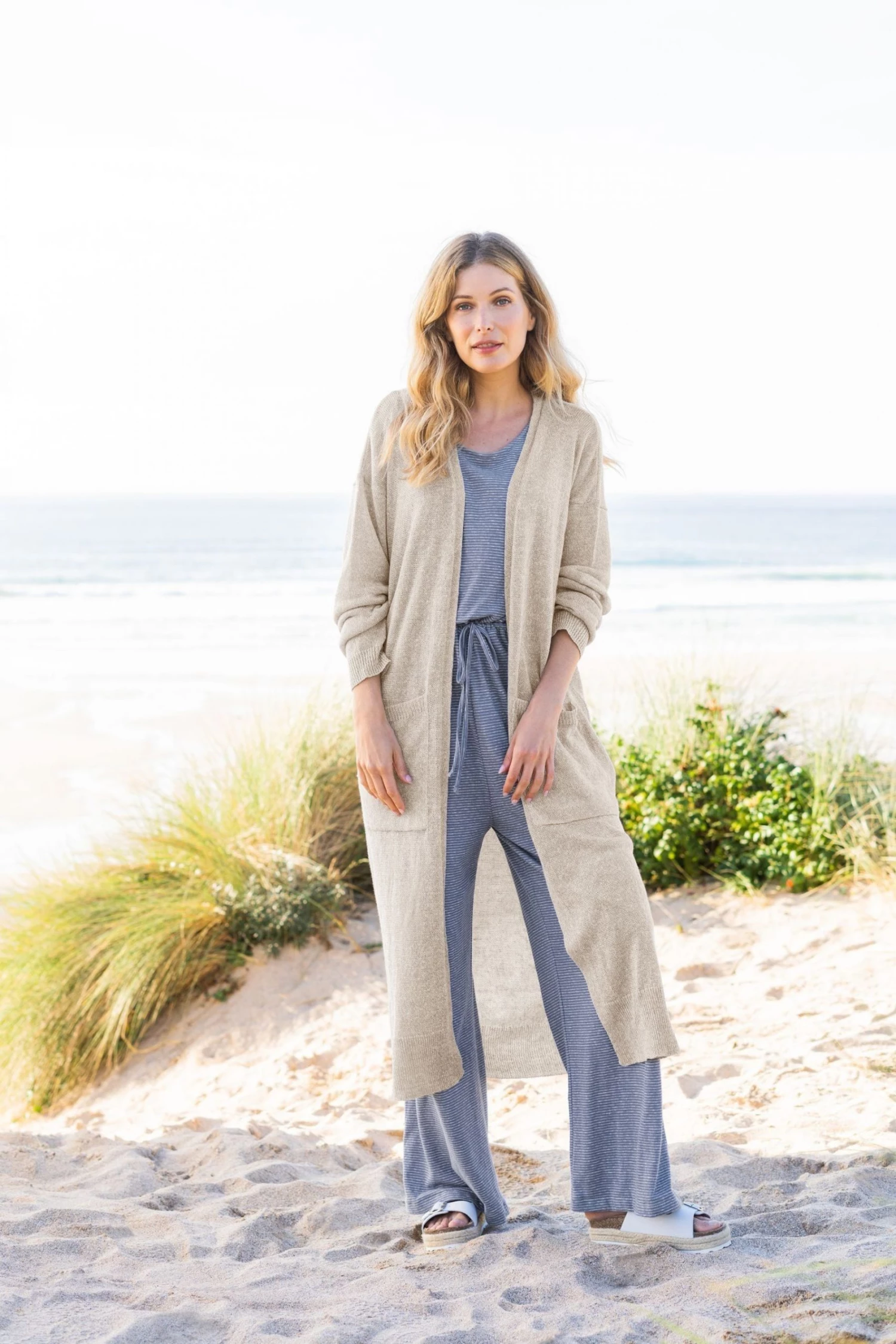 Crafted in pure linen for cooling breathability with a cosy feel that’ll make it a winner all year round, their longline cardigan is the ultimate shrug it on and go option. With fabric sourced from a spinner that holds a host of accreditation including Higgs Index, STeP by OEKO-TEX® and Content Claim Standard, it’s woven with a mouline effect and has a slouchy shape with patched pockets and side splits.