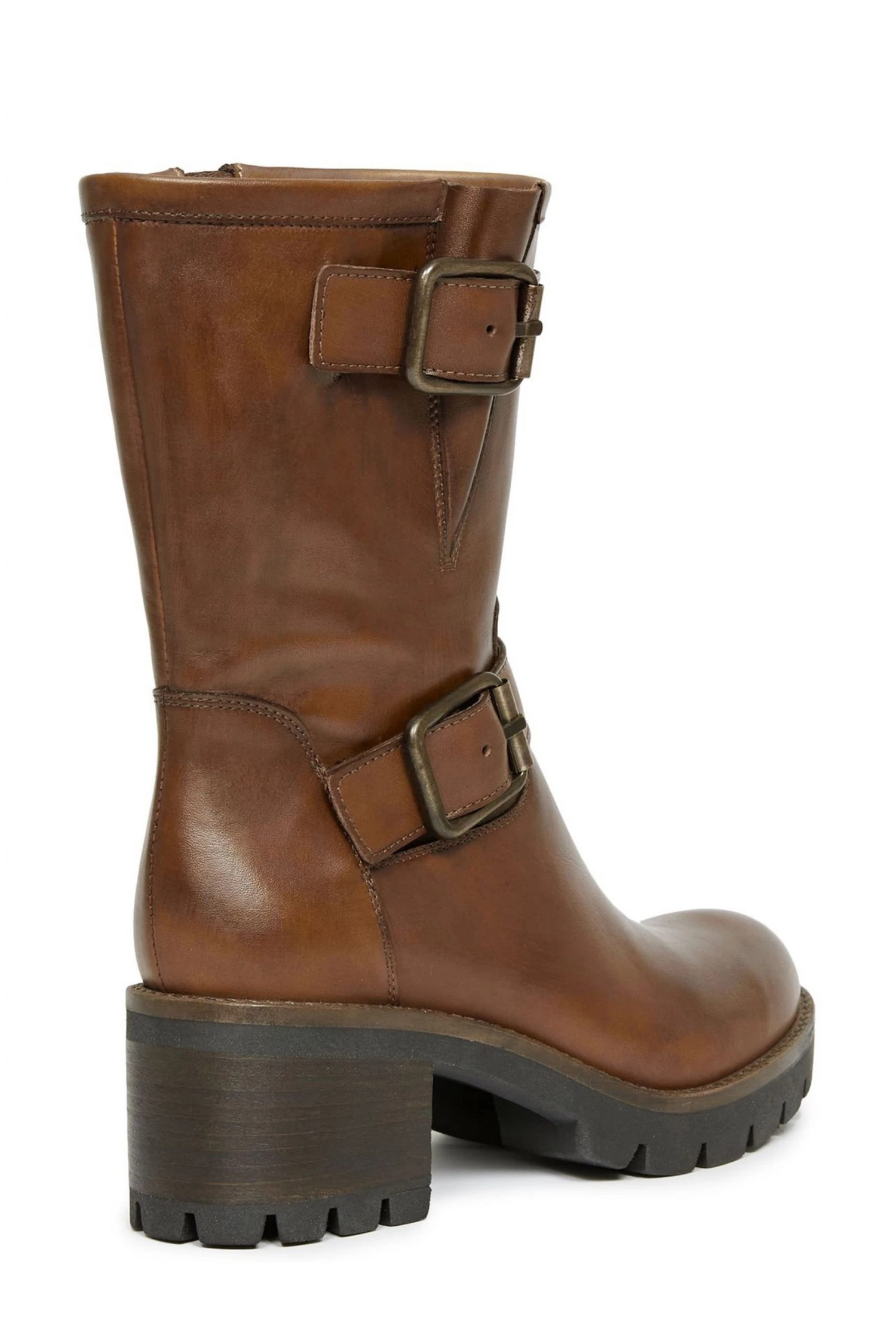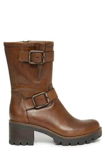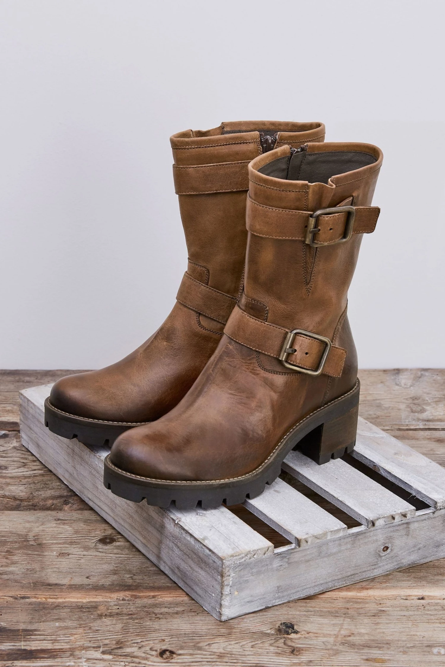 A boot that can do it all, this biker style is perfect for pairing with everything from workwear looks to laid-back outfits on the weekend. Celtic & Co. crafted this pair in leather and applied careful burnishing by hand to give the material an air of vintage appeal. Trend-driven elements come through at the chunky outsole, which features deep cleating and a block heel with a wearable rise, and the straps with their antique brass roller buckles. Slip them on and off with ease using the full-length side zip.